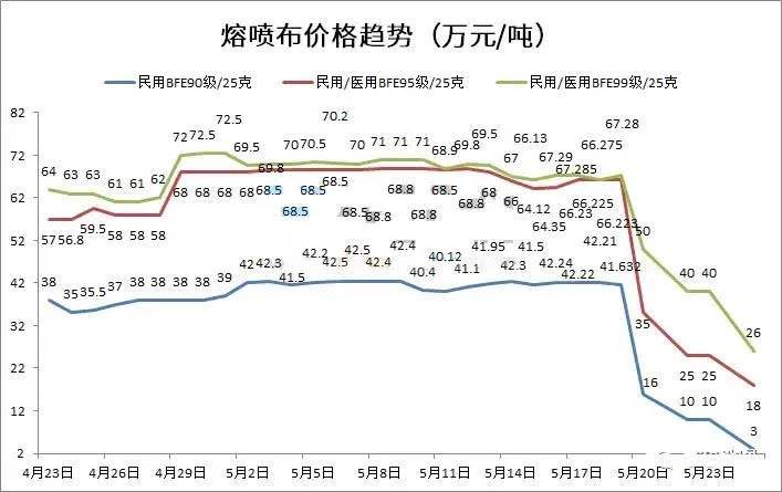 隨著疫情逐漸地穩定,隨著越來多的企業想分一杯羹,熔噴布很快就出現了供過于求,如果這些作坊生產出來的熔噴布做成口罩流向國際市場,會嚴重影響國家商譽,對商家和國家都沒有好處。再加上國內熔噴布審查標準變嚴格,大部分不合格的熔噴布被退貨,導致了這次熔噴布價格的暴跌。