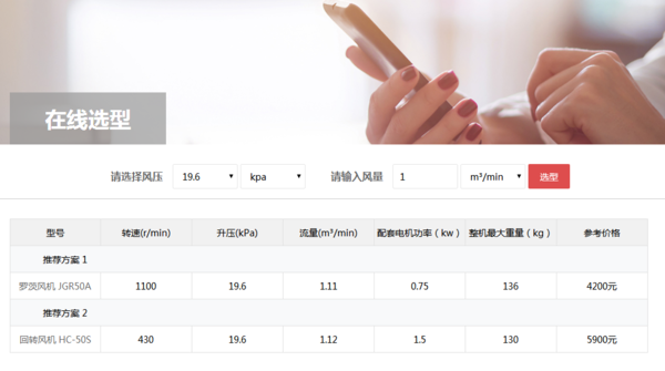 此外,還可以通過風機選型系統查詢回轉風機價格,如下圖客戶僅需輸入風量、選擇風壓,就可以方便、快速、準確、可靠地進行羅茨鼓風機、回轉式鼓風機等各類容積式風機的選型和價格查詢工作。風機選型系統地址:http://m.zgsdl.cn/search.php