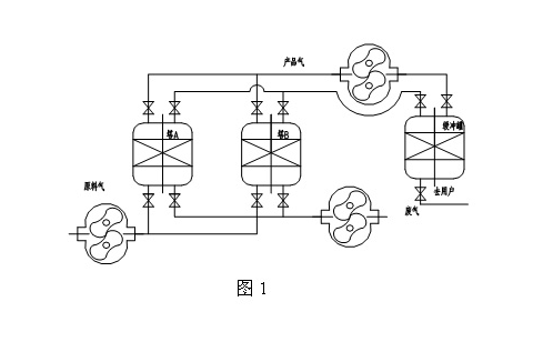 變壓吸附又稱PSA在制氧較傳統的深冷制氧在許多方面具有獨特的優勢,因此在氧氣純度要求不太高的場合,使用日益廣泛,具有裝置逐步擴大的趨勢,其裝置示意圖見圖1。羅茨風機先將原料空氣送入塔內,塔中分子篩吸附空氣中的氮氣、二氧化碳及水份等,在塔內獲得一定純度的氧氣,吸附劑飽和后切換空氣進入塔B,同時利用真空泵抽氣,使塔A的壓力下降,將氮氣等從分子篩中脫離出來,這樣循環,則可獲得氧氣,氧氣再經過壓縮機的加壓進入兩個緩沖罐,由緩沖罐向用氧單位供氣。變壓吸附裝置中的關鍵動力設備,原料空氣的正壓輸送一般采用羅茨鼓風機,真空解吸過程中廢氣的抽除,通常也采用羅茨真空泵。關于向用戶加壓供氣的壓縮機,以前一般采用螺桿或活塞式壓縮機,但這兩種機器的壓力比較高,適合高壓氣體的輸送,但隨著工藝水平的不斷改進,對于低壓小流量產品的氣體輸送也開始轉向使用羅茨鼓風機,簡稱氧壓羅茨鼓風機,本文針對氧壓羅茨鼓風機的市場、結構特點、設計制造關鍵及使用運行作簡單的說明,進一步推進羅茨鼓風機在制氧行業的應用。