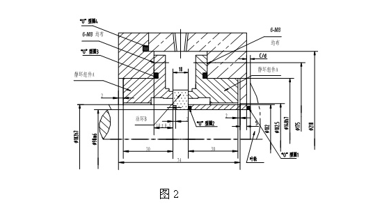 首先要保證氧氣能夠密封在機殼與墻板所形成的密封腔內,不會由于軸封泄漏到兩端的油箱內與油接觸,致使在達到一定的溫度、濃度時發生爆炸而釀成事故。為達此目的,選用了合肥通用機械研究所的機械密封結構(見圖2),該結構為非平衡式雙端面機械密封,具有結構簡單、裝配方便、密封可靠等特點,端面配以襯套上的兩組“O”型圈1和2,可以從徑向、軸向兩個方向實現氣體的可靠密封,以保證氣體不外漏,端面配以“O”型圈3和4,可以保證機械密封的密封冷卻液不向內、外泄漏。